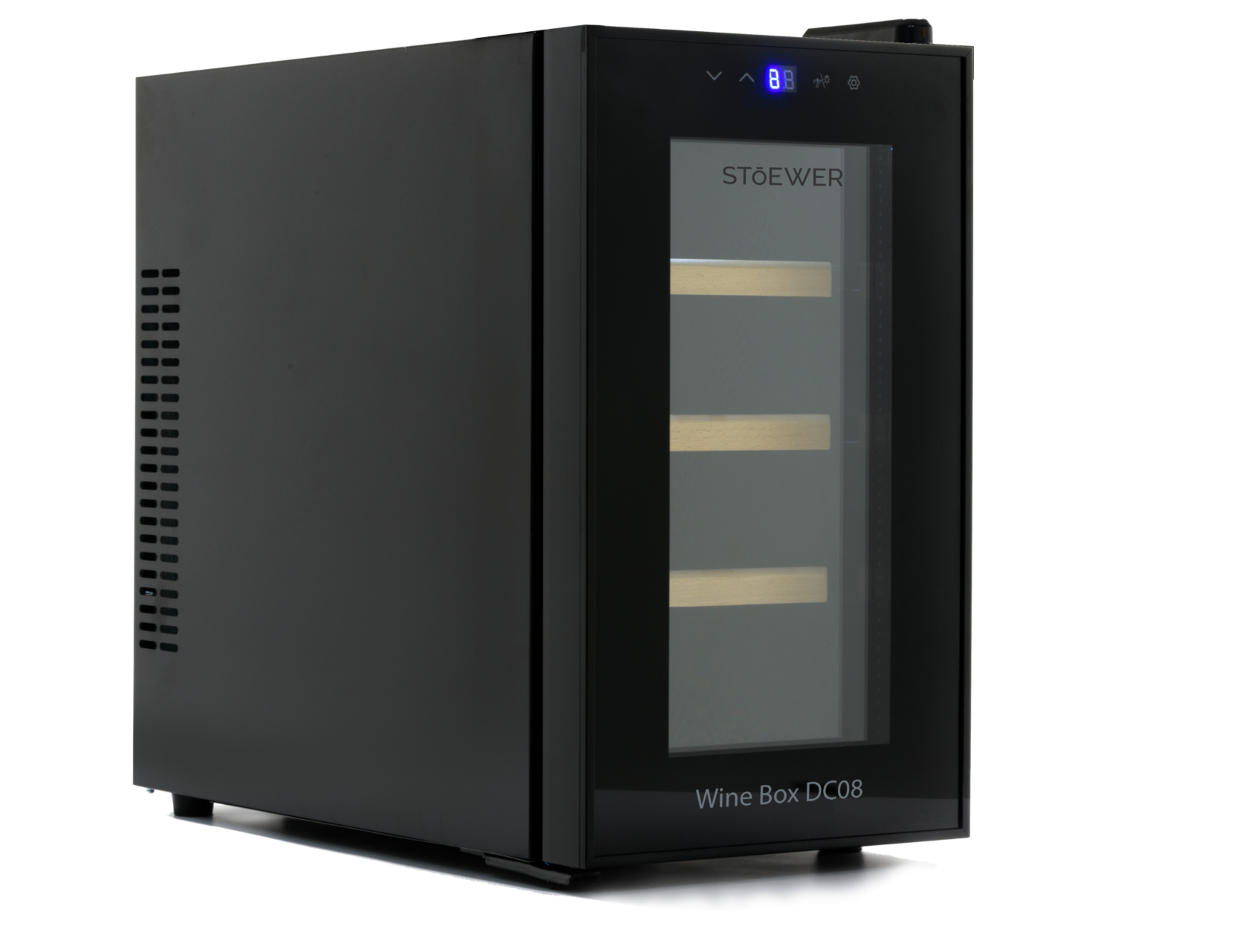 Винные шкафы STOEWER выпускаются в 2 форматах. Младшая модель рассчитана на 8 бутылок, а старшая модель вмешает в себя 12 бутылок стандартного размера.